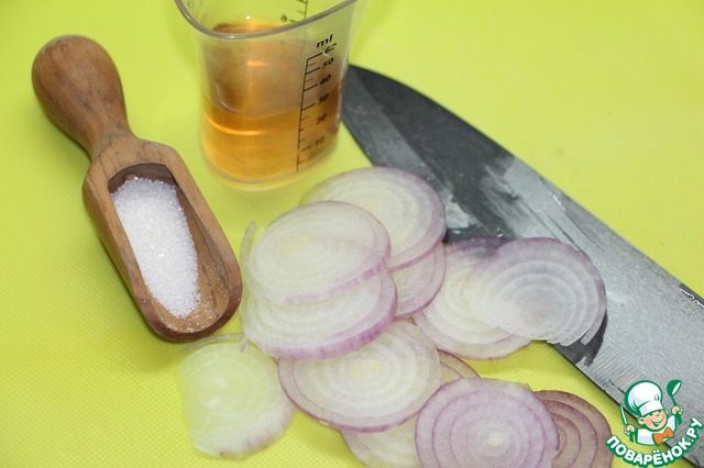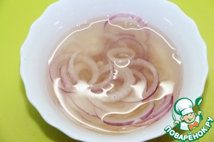 Лук очистить, порезать кольцами или полукольцами. Замариновать в смеси воды, яблочного уксуса и сахара.