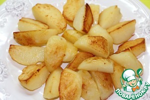 Раскалить растительное масло на сковороде и быстро обжарить картофельные ломтики до румяной корочки.