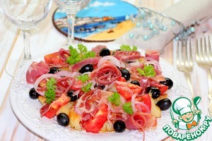 Предлагаю Отведать восхитительный салат в Средиземноморском стиле- обжаренный золотистый картофель, ломтики мясистых спелых томатов, маринованный хрустящий лучок, солоноватая сырокопченая ветчина и горчичная заправка. Вот насколько он в стиле Средиземноморья меня лично берут некоторые сомнения, но в Московском ресторане его позиционируют так. Спорить я не стала, поскольку было невероятно вкусно. Просто подкорректировала, отшлифовала на свой вкус и вышло отменно! Рекомендую как полноценный вкусный ужин. Да и для прихода неожиданных гостей салат хорош.