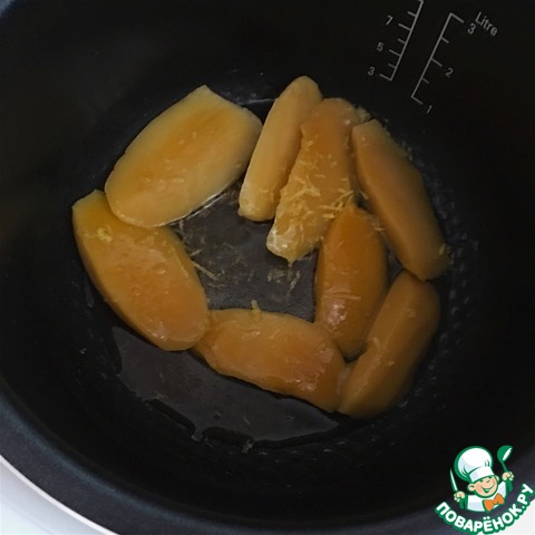 В емкость, в которой будете карамелизовать фрукт, налейте воду. Я это делаю в мультиварке на режиме жарка. Добавьте сахар и поставьте на огонь, доведите до кипения. Теперь сразу всыпьте гвоздику, бадьян, корицу. Перемешайте. Должна получиться такая пряная сахарная жидкость. Теперь кладём в емкость манго. (очищенный и порезанный на дольки). Аккуратно перемешиваем и добавляем лимонную цедру