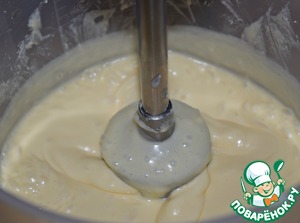 Не переставая взбивать, ввести по одному яйца. Влить сливки.