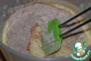 В три приёма ввести сухие ингредиенты в яично-масляную смесь, аккуратно перемешивая лопаткой снизу вверх, пока тесто не станет однородным.