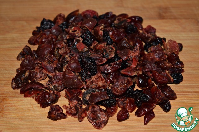 Вяленую вишню нарезать на 2-4 части и перемешать с клюквой.