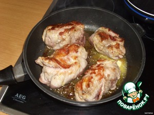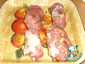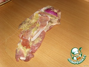 Одну сторону смазываем горчицей, кладём бекон, 1/4 луковицы и заворачиваем.