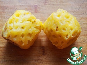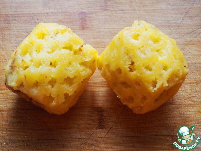 Срезать верхушку и основание ананаса. Острым ножом срезать кожуру (сверху вниз). Удалить черные глазки (я воспользовалась овощечисткой). Вырезать сердцевину диаметром, примерно, 3 см.