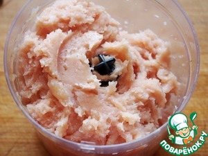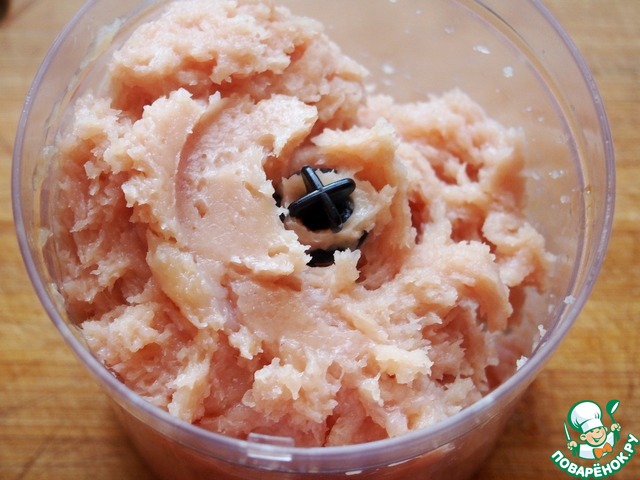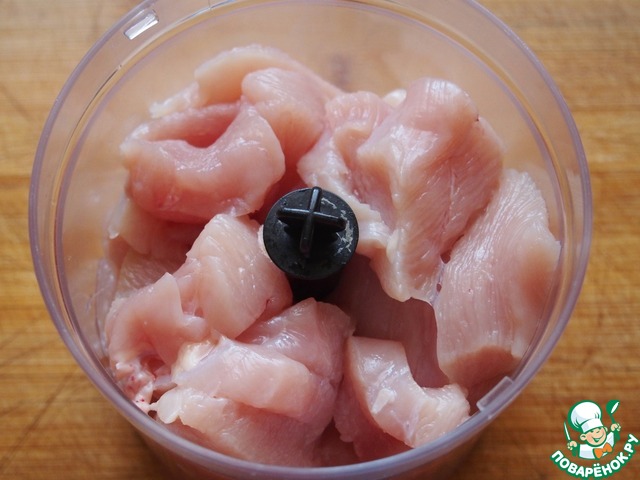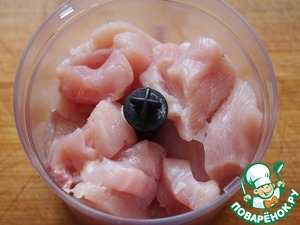 Куриное филе промыть, нарезать на кусочки и поместить в блендер.