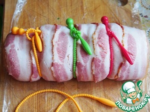 Рулет обернуть полосками бекона и, по желанию, закрепить кулинарной нитью или силиконовыми шнурками. Готовить в духовке, заранее разогретой до 180 градусов, 40 минут. Если в процессе готовки бекон начнет подгорать, накрыть фольгой.