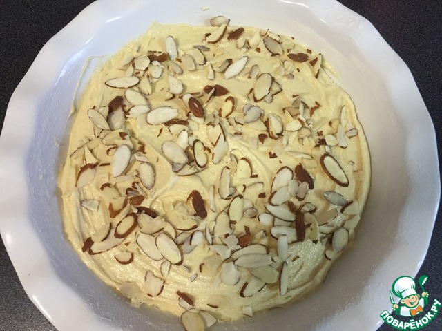 Форму смазать сливочным маслом и посыпать мукой. Выложить приготовленное тесто, разровнять и посыпать сверху миндальными лепестками.