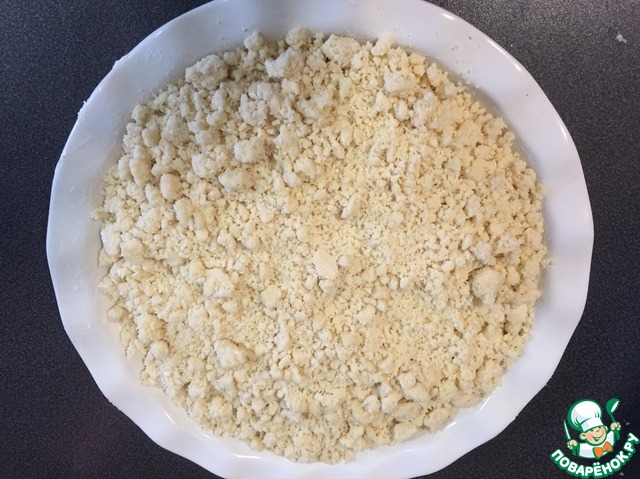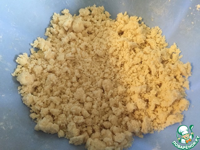 Оставшуюся половину масла, 1/2 стакана сахара и 1 стакан муки растираем руками до состояния крошки.