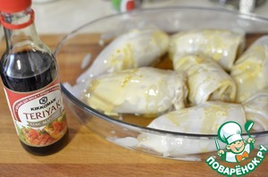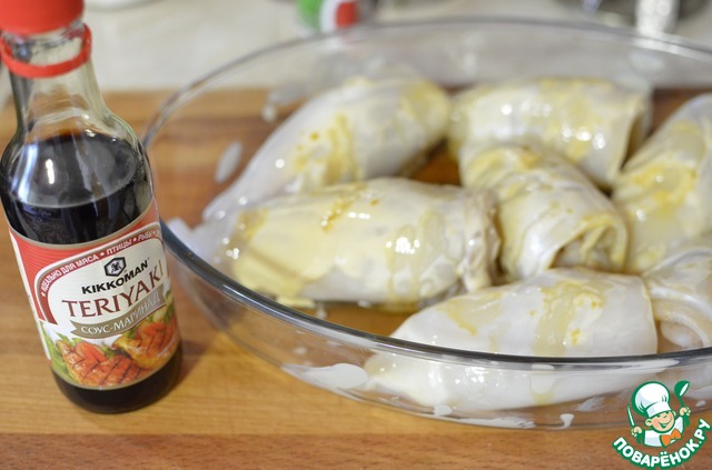 Кальмары смазать йогуртом и полить каждый рулет 0.5 ст. л. соуса терияки "Киккоман" соусом.