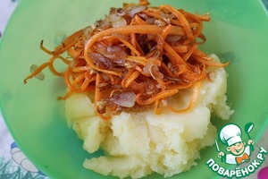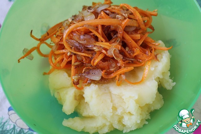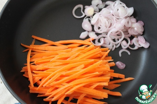 Для начинки № 1: Морковь нарезать тонкой длинной соломкой, лук кольцами, добавить 2 ст. л. растительного масла и обжарить до золотистого цвета.