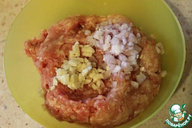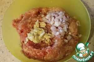 Для начинки №2: В фарш добавить мелко нарезанный лук и чеснок, перемешать.