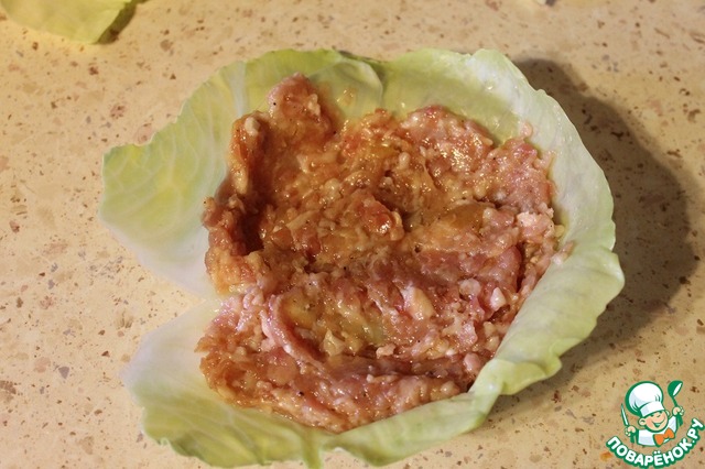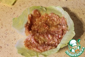 На остывший лист капусты выложить 1-2 ст. л. фарша, разровнять его.