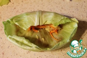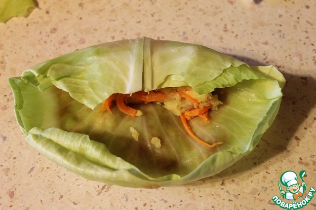 Сверху накрыть еще одним листом капусты и, ближе к краю, положить начинку из картофеля и овощей.