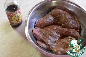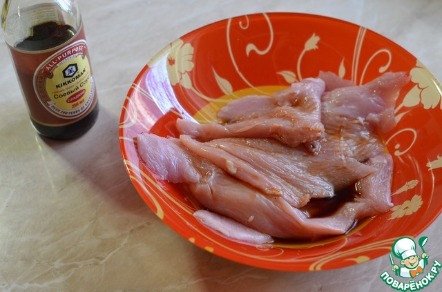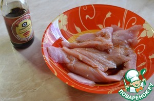 Грудку порезать на пластины и так же мариновать в 2 столовых ложках соевого соуса около часа.