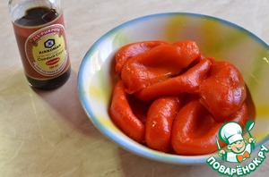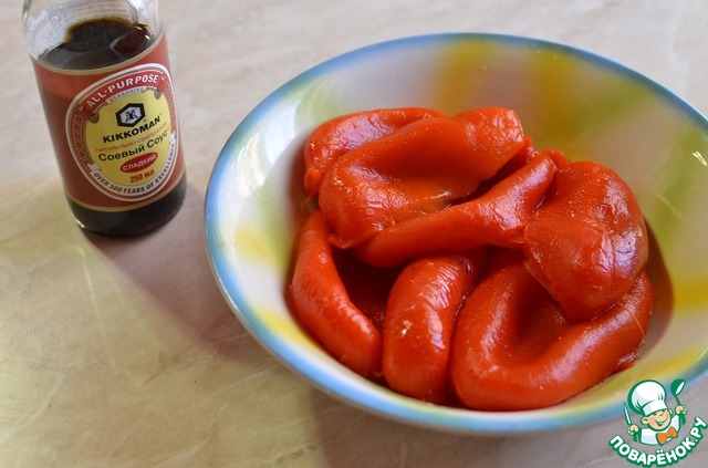 Перец почистить от кожуры и семечек и замариновать в 1 столовой ложке соевого соуса "Киккоман"