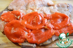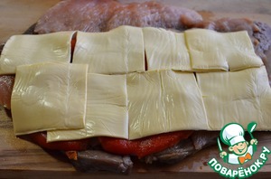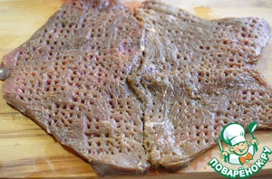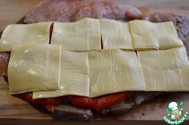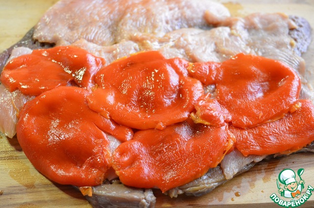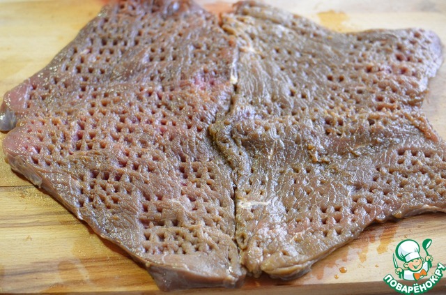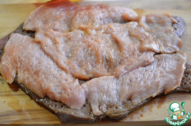 Индюшатину так же отбить и выложить на говядину, таким образом, чтобы была заполнена вся площадь мяса.