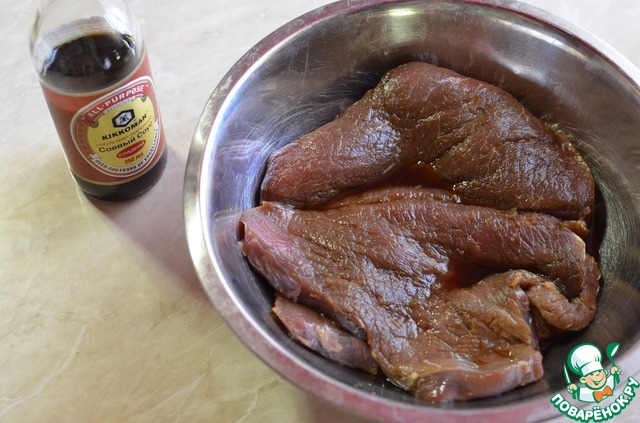 Говядину мариновать в 2 столовых ложках соевого соуса "Киккоман" примерно 1 час