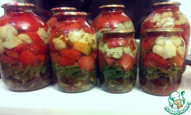 Теперь о зимней заготовке. Сквашенную туршу отцедить, рассол закипятить, овощи разложить по банкам, залить рассолом, прикрыть крышками и поставить на стерилизацию, 0.7л банку на 20 минут. Затем закатать крышками.