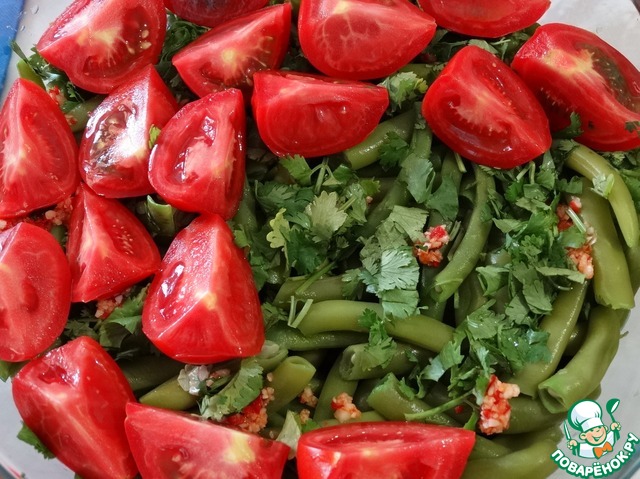 Затем слой нарезанных на дольки помидоров, зелень и перечно-чесночную смесь.