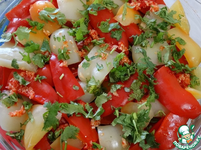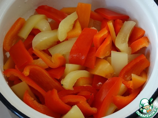 Болгарский перец очистить от семян и нарезать на крупные кусочки. Бланшировать в отдельной посуде 1 минуту, затем погрузить в холодную воду для остывания. Воду слить.