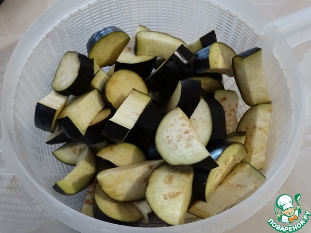 Отдельно в соленой воде отвариваем кусочки баклажанов. Если баклажаны маленькие и не толстые, то достаточно нарезать на кружочки, толщиной в 1 см.