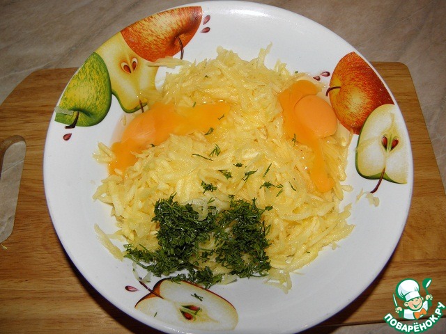 К кабачку добавить измельченный укроп и яйца, все перемешать
