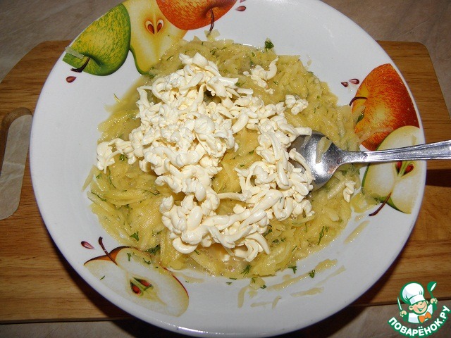 Затем добавить натертый на крупной терке плавленый сыр, хорошо перемешать