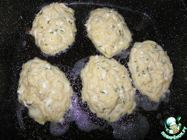 Разогреть растительное масло на сковороде, ложкой выкладывать массу
