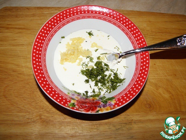 Для соуса: смешать сметану с мелко рубленным укропом и пропущенным через пресс чесноком