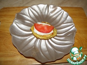На тарелку выкладываем один оладий, смазываем его сметанным соусом, сверху кладем дольку или кружок помидора