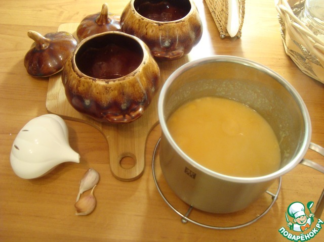 • Взяла 2 керамических горшка. Обмазала стенки горшка сливочным маслом. Горох сварился. Приготовила 2 дольки чеснока. По 1 дольки на горшок. Чеснок не нужно чистить. Положим его прямо в шкурке.