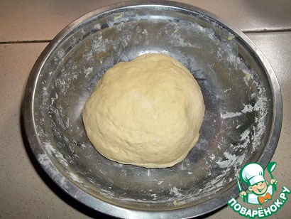Просеянную муку смешать с семолиной и солью. По поводу семолины - у нас семолина двух видов, среднего и мелкого помола, здесь нужна семолина мелкого помола (не знаю если подойдет манная крупа, в принципе в переводе пшеничная семолина - это манная крупа, но я с манкой не пробовала готовить). Сделать углубление в середине, влить оливковое масло, затем разведенные в теплой воде дрожжи. Вымешивать тесто деревянной лопаткой 5 минут. Если тесто липкое, добавить немного муки, вымесить рукой. В итоге должно получиться очень мягкое и послушное тесто. Накрыть полотенцем, оставить в теплом месте на 40 минут. Фото после подъема теста.