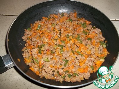 Пока тесто поднимается приготовить начинку. Морковь натереть на средней терке, зеленый перец и лук мелко нарезать. Спелый помидор ошпарить кипятком, снять кожицу и тоже мелко порезать. Слегка обжарить на оливковом масле лук и перец, добавить морковь, жарить, помешивая 5 минут. Добавить мясной фарш (у меня свиной), соль, смесь перцев и кориандр, готовить еще минут 5 до готовности фарша. Начинка готова.