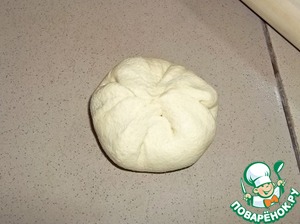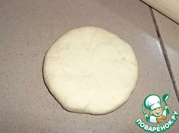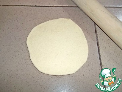 Тесто разделить на 7-8 кусочков. Рабочую поверхность и скалку присыпать мукой не нужно, тесто очень послушное. Раскатать кусочек теста не очень тонко в круглую лепешку (примерно 13см диаметром),