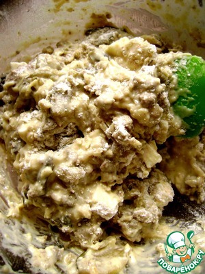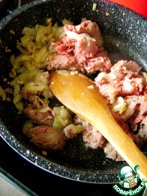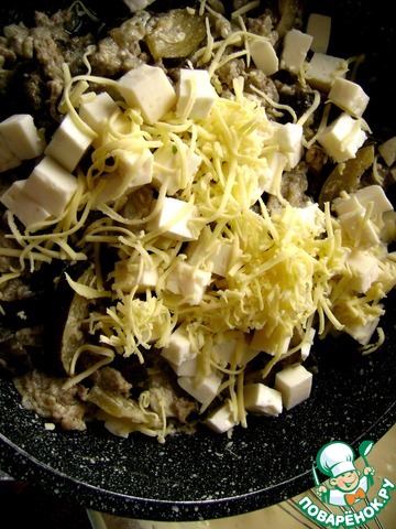 Смешать обжаренные кабачки и баклажаны с фаршем, брынзой и половиной сыра.
