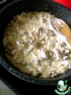 Залить фарш сметаной и тушить до готовности фарша и загустения соуса. Послить слегка, поперчить по вкусу. Охладить.