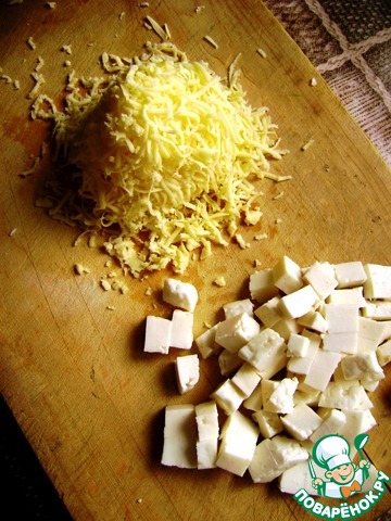 Брынзу нарезать кубиками, сыр натереть на мелкой терке. Брынзу лучше предварительно вымочить.