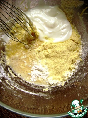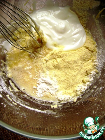 В отдельной миске смешать яйцо, сметану, тертый сыр, чуть соли и просеянную с разрыхлителем муку двух видов.