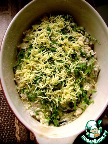 Выложить в смазанную форму, разровнять, поспать сверху мелко шинкованной зеленью ( у меня сельдерей и базилик) и второй половиной сыра.