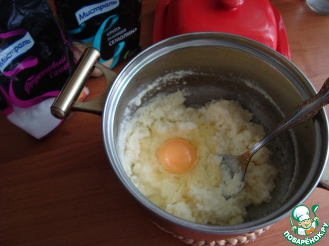 • Когда каша остынет, кладём ваниль или сахар ванильный и сырое яйцо. Всё перемешиваем.