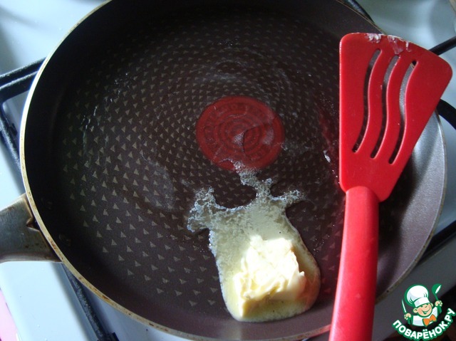 • На сковороду, где будите делать оладьи, выкладываем масло. Разогреваем сковороду.