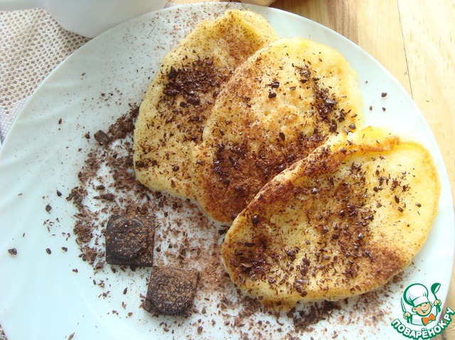 • Выкладываем оладьи на тарелку и присыпаем натёртым шоколадом.