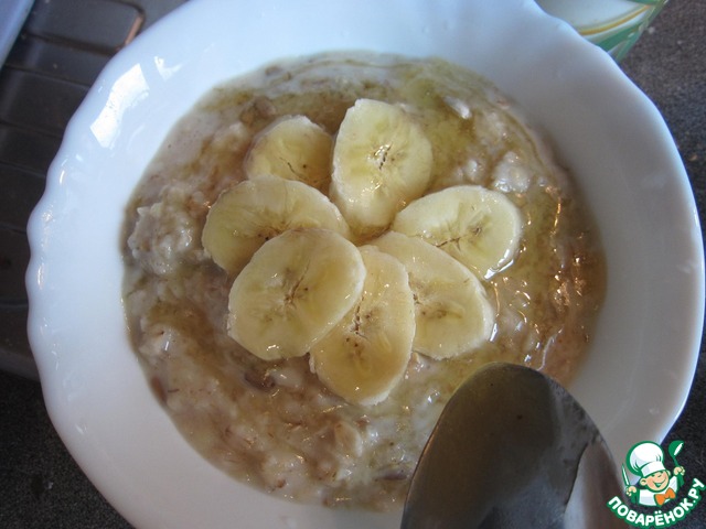 Разложим поверх каши ломтики банана, а также польем немного меда.