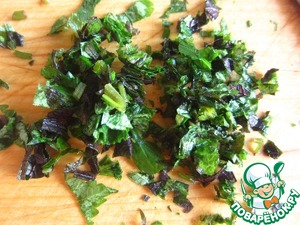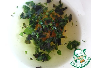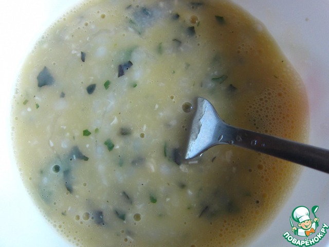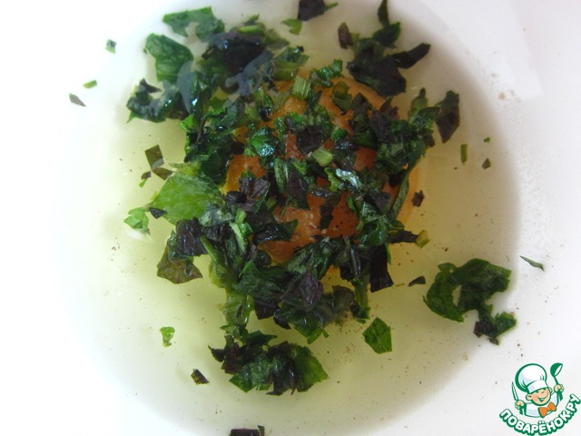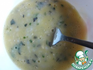 В миску с разбитым яйцом добавляем периллу, соль и перец. Взбиваем вилкой.