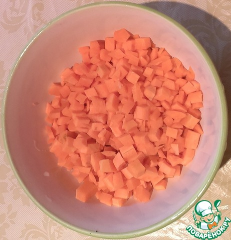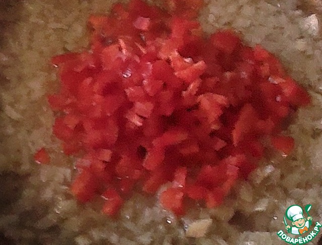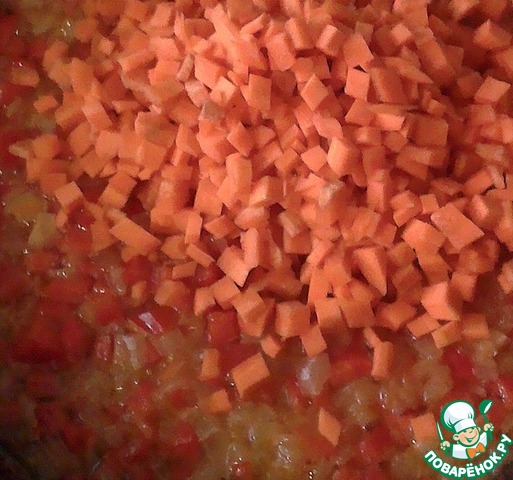 - Высыпаем морковь, перемешиваем. Обжариваем, как и предыдущие ингредиенты. Ключевое слово: "чуть":))