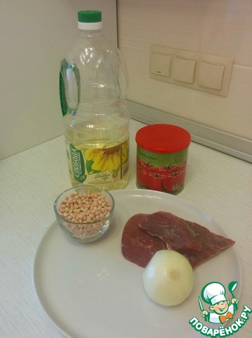 Итак: подготовить продукты, мясо помыть, нарезать небольшими кубиками, лук очистить, помыть, нарезать кубиками, горох промыть.