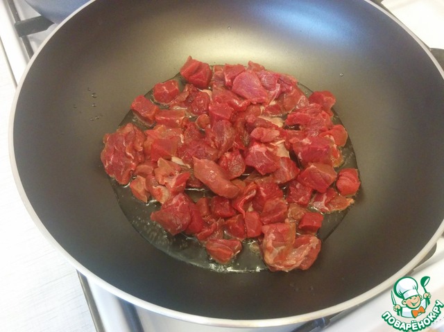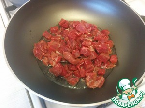 Берем сковороду, ставим на средний огонь, наливаем масло, когда сковорода разогреется, выкладываем мясо, обжариваем.