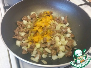 Когда мясо обжарилось, добавляем лук, куркуму, соль, перец, обжариваем.