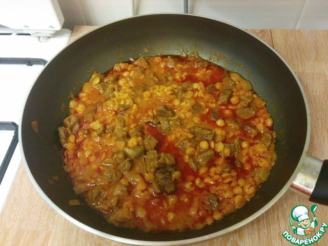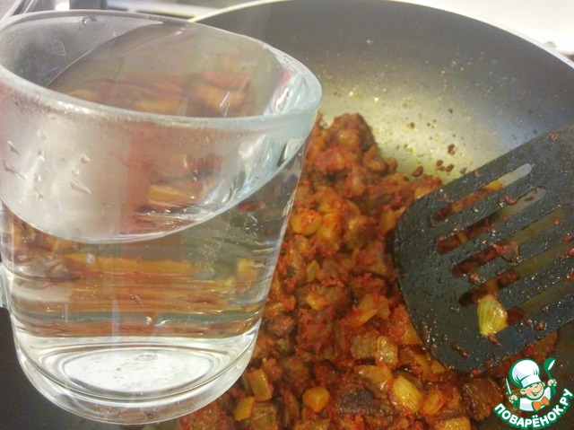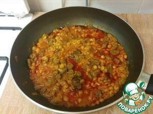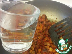Добавить томатную пасту, перемешать, слегка обжарить. Влить один стакан кипятка (250 мл). Накрыть крышкой, поставить на очень маленький огонь (чтобы еле кипело), тушить полтора часа, при этом смотреть чтобы вода не выкипала, если нужно добавить воды.